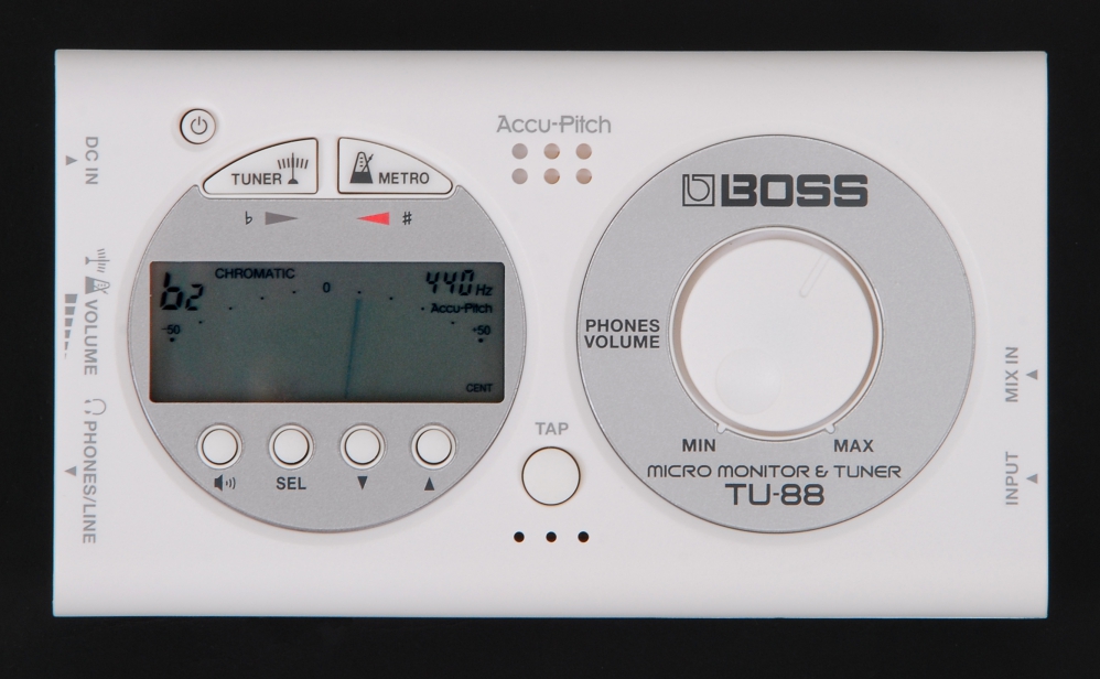 Small, cool and feature-packed, BOSS’s new TU-88 is a must-have for guitar and bass players on the go. Available in black or white, it provides needle-accurate tuning, a metronome, and a headphone amp with speaker simulator for monitoring effects, including compact pedals.