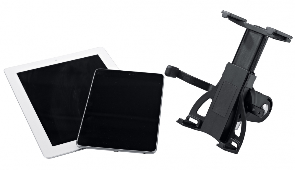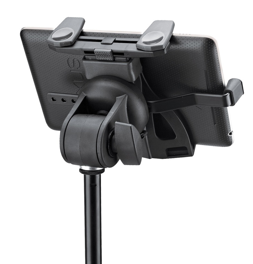 A universal tablet holder for microphone stands. The holder can be attached quickly and easily to any microphone stand with the 3/8" internal thread. A unique tensioning mechanism with a clamping width between 120 and 220 mm means the holder is suitable for holding securely all standard tablet PC models like iPad, iPad Air, iPad mini, Amazon Kindle, Samsung Galaxy Tab, Google Nexus, Asus Transformer or Microsoft Surface. The holder is especially suitable for tablets with a protective sleeve or case.