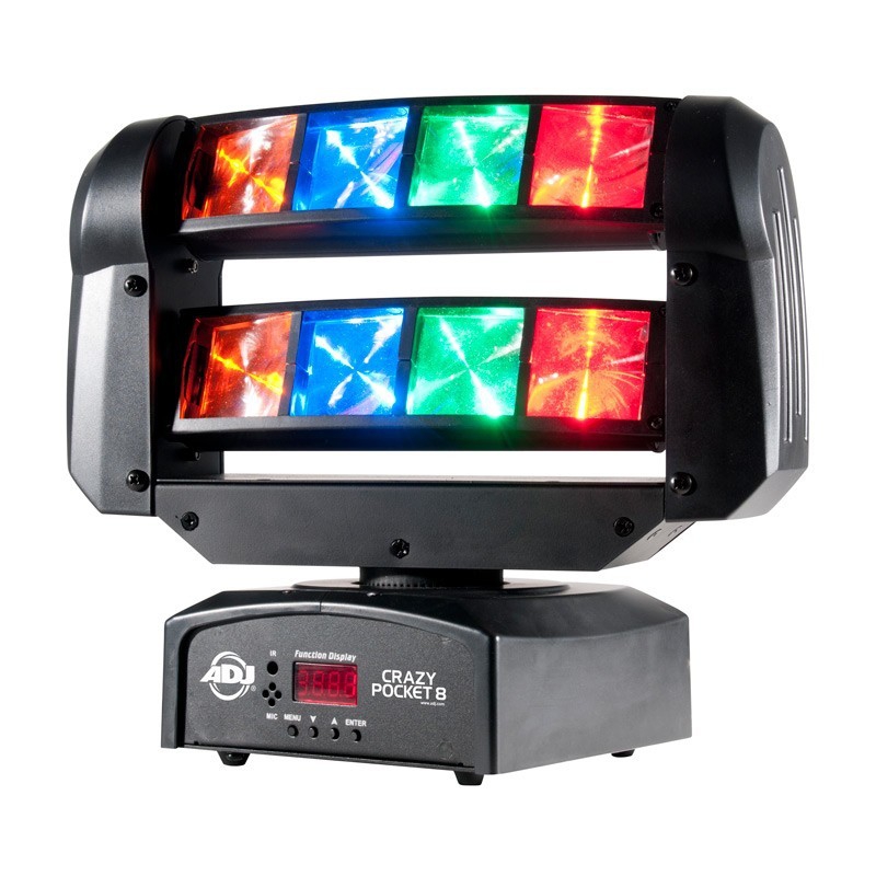 The ADJ Crazy Pocket 8 Moving Head creates exciting lighting effects with its quick sweeping beams and 8-Zone chasing, pulsing and strobing LEDs. This unique fixture features two independently tilting bars (each with 4 lenses) that project tight, 4 degree beams of light from 3-Watt RGBA LEDs.