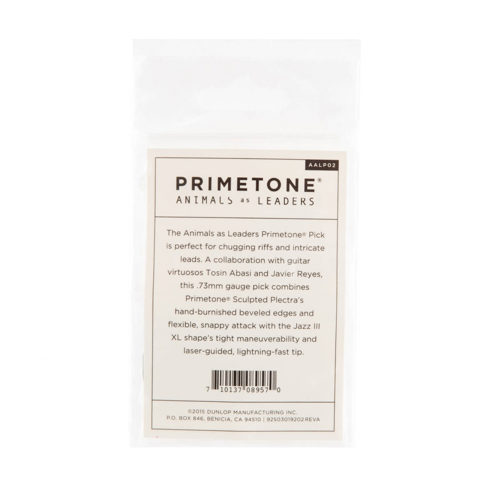 The Animals as Leaders Primetone? Pick is perfect for chugging riffs and intricate leads. A collaboration with guitar virtuosos Tosin Abasi and Javier Reyes, this pick combines Primetone Sculpted Plectra's flexible, snappy attack with the Jazz III XL shape's tight maneuverability and laser-guided, lightning-fast tip.
