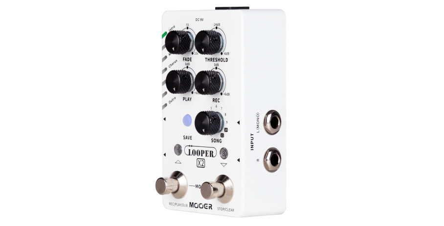 Additional features of the Looper X2 include a FADE knob for controlling and toggling the Fade out function for each loop. Users can also toggle an Auto Rec function to start recording a loop every time a guitar signal input is detected by employing the THRESHOLD knob. Additional knobs include separate volume level controls for Recording and Playback, as well as an 11-option knob for scrolling through the song banks. The dual footswitch setup offers familiar Looper controls and for users desiring more control, the Looper X2 also supports an external footswitch that can perform a variety of operations like cycling through different parts of the current selected song bank. See the manual for more information on compatibility.